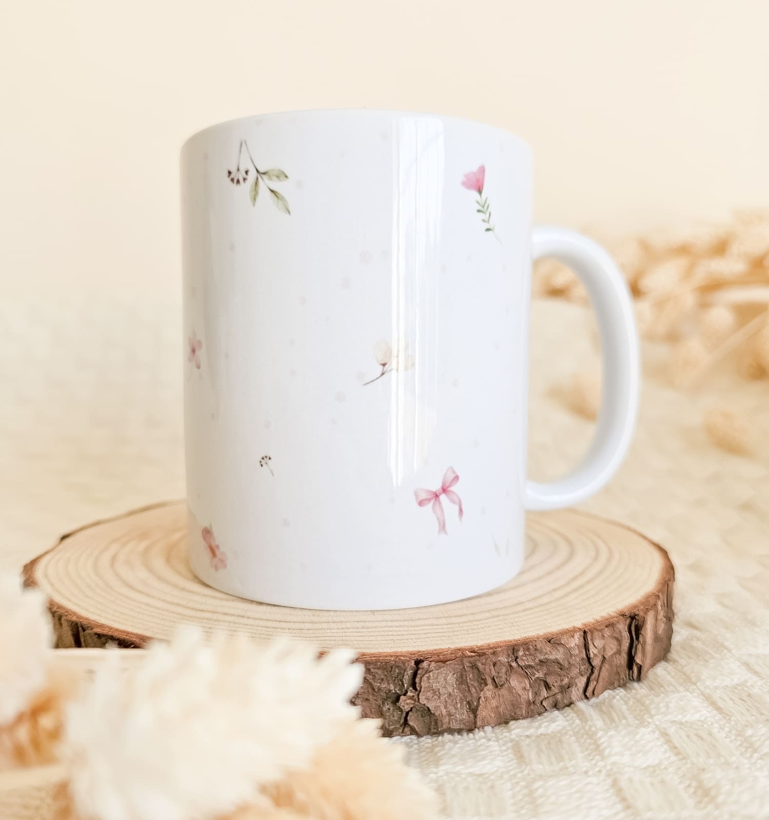 Caneca com design delicado e palavra “mamã” com laços e flores, um presente simples, cheio de amor e perfeito para surpreender.