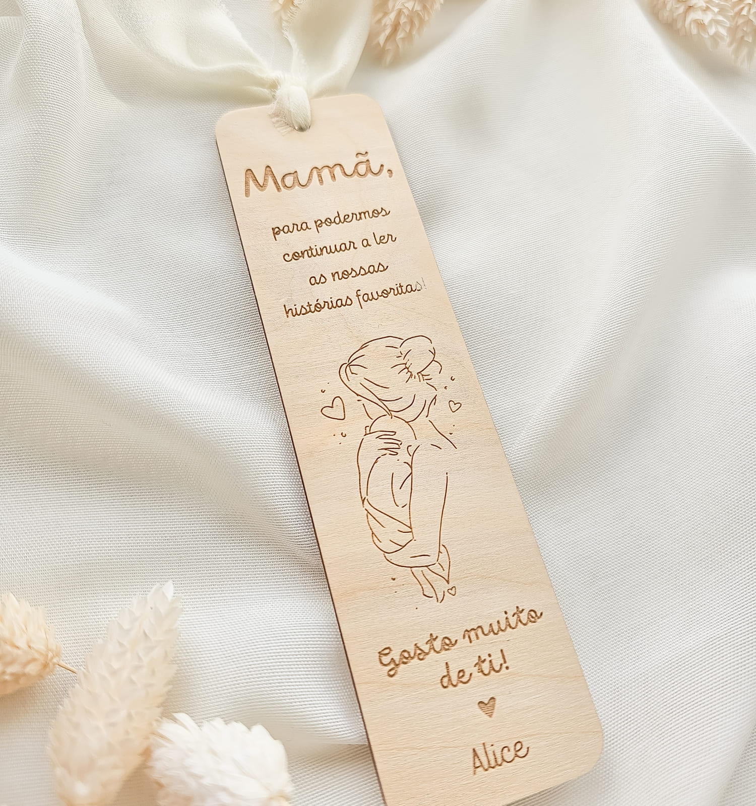 Marcador de livro em madeira personalizado para o Dia da Mãe com nome e fita decorativa. Um presente delicado e cheio de significado.
