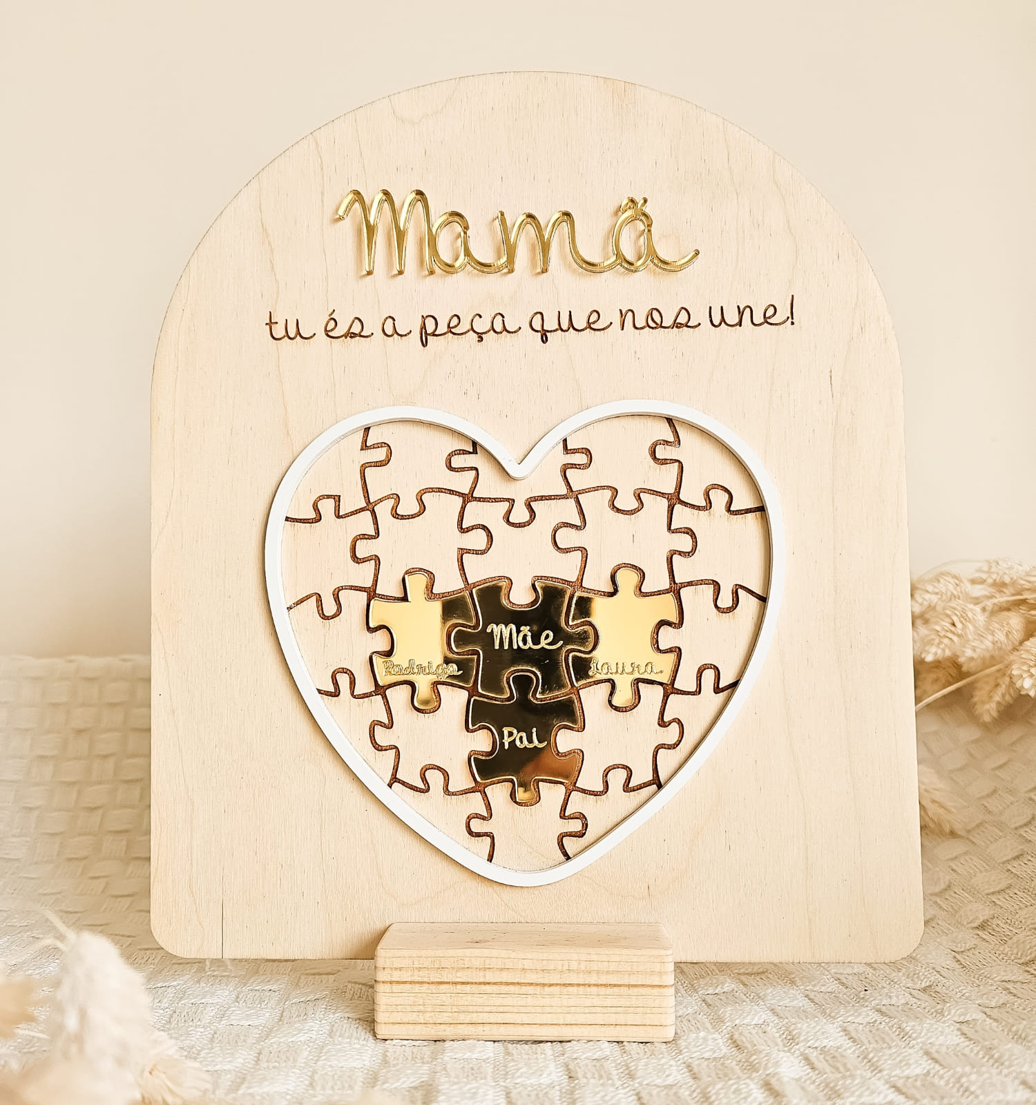 Placa puzzle em madeira personalizada com nomes da família. Um presente emotivo para mãe, pai ou avós, cheio de significado e amor.